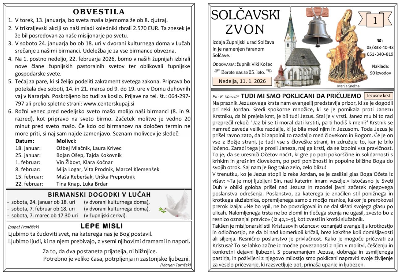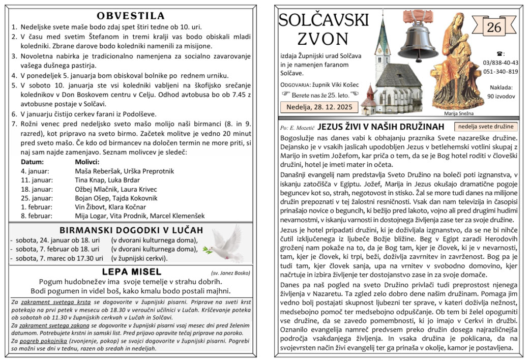 Svete maše od 29. 12. 2025 do 11. 1. 2026 – ob nedeljah so svete maše ob 10 h
