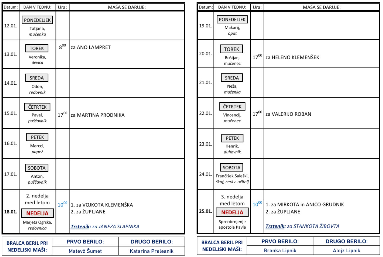 Svete maše od 12. 1. do 25. 1. 2026 – ob nedeljah so svete maše ob 10 h