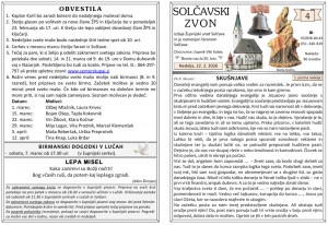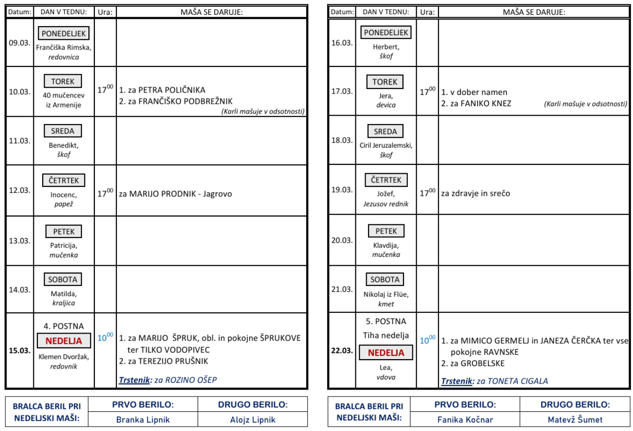 Svete maše od 23. 3. do 5. 4. 2026, na Cvetno nedeljo je sveta maša ob 10 h, na Veliko Noč bo sveta maša ob 7 uri, pol ure prej pa vstajenjska procesija.