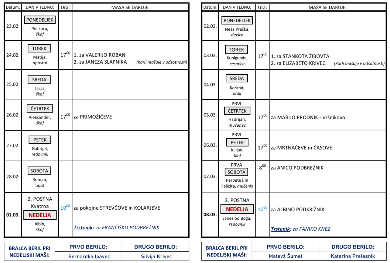 Svete maše od 23. 2. do 8. 3. 2026 – ob nedeljah so svete maše ob 10 h