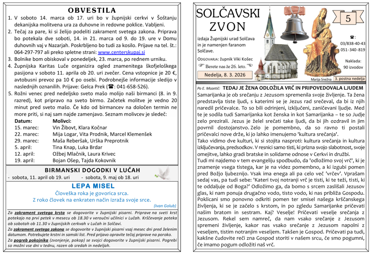 Svete maše od 9. 3. do 22. 3. 2026 – ob nedeljah so svete maše ob 10 h
