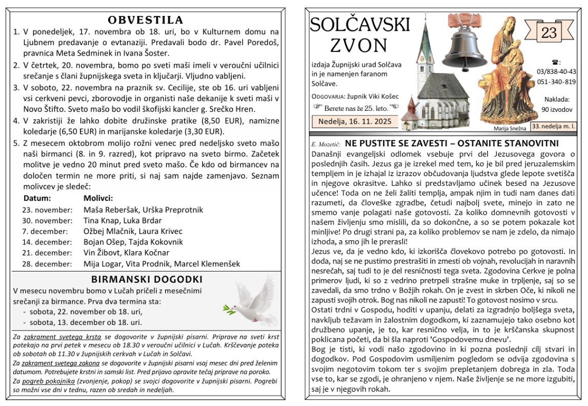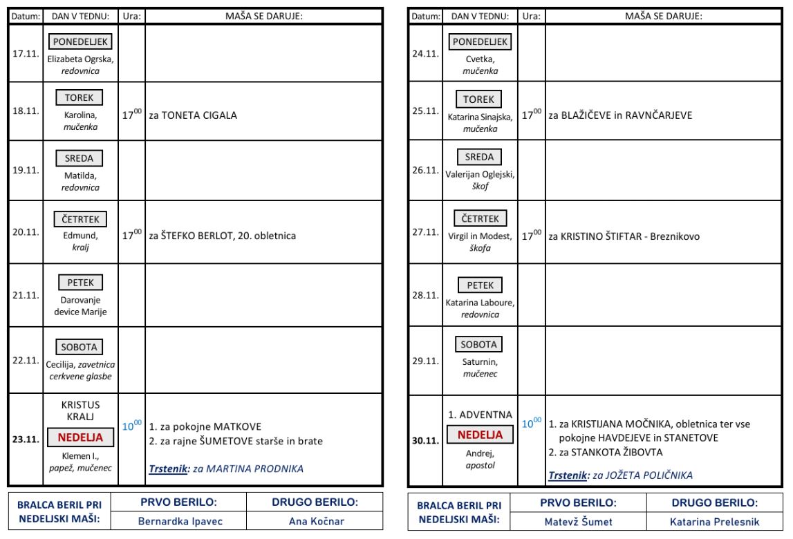 Svete maše od 17. 11. do 30. 11. 2025 – ob nedeljah so svete maše ob 10 h