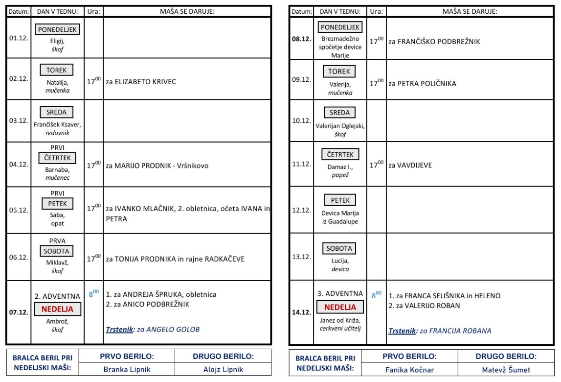 Svete maše od 1. 12. do 14. 12. 2025 – ob nedeljah so svete maše ob 8 h