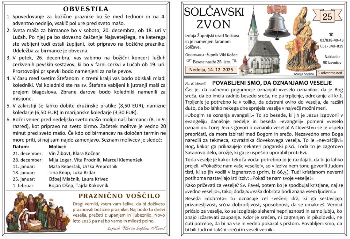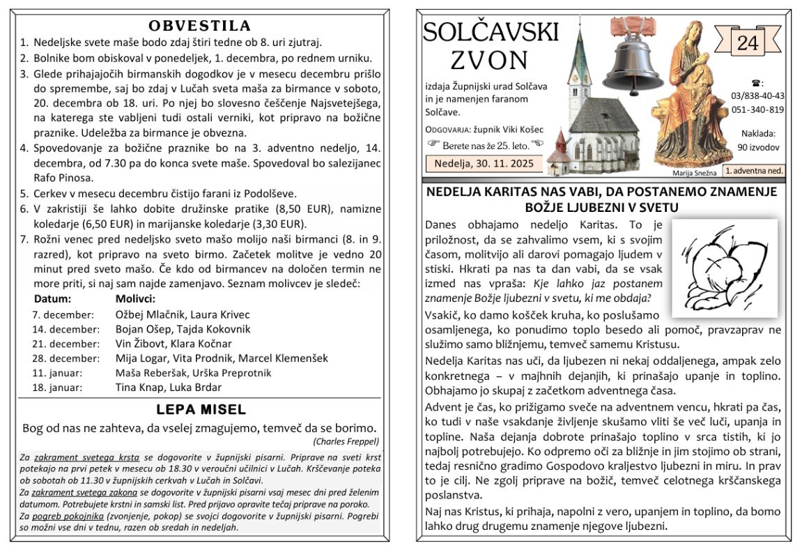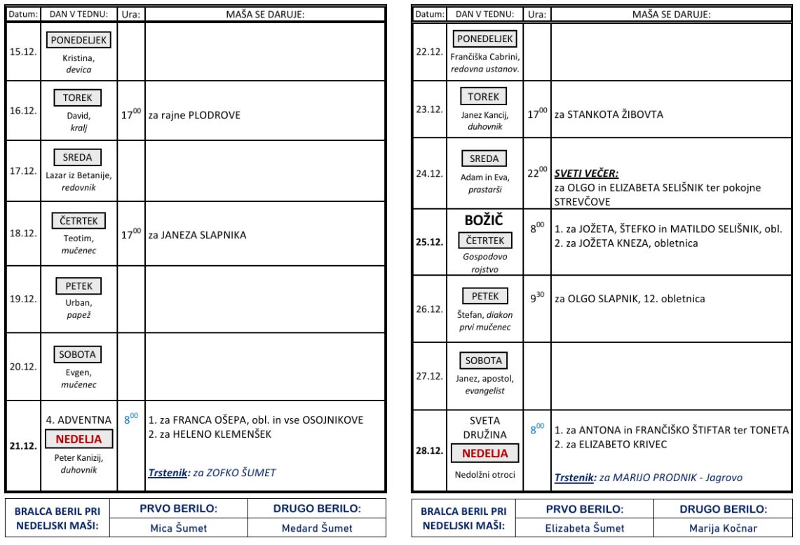 Svete maše od 15. 12. do 28. 12. 2025 – ob nedeljah so svete maše ob 8 h